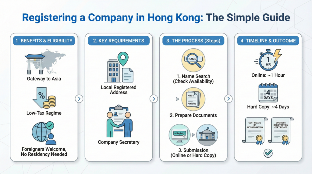 At Coffice, we understand that navigating government regulations can feel daunting. However, Hong Kong’s system is designed to be business-friendly. This guide breaks down exactly how to establish your presence here, from the initial name search to receiving your official documents.